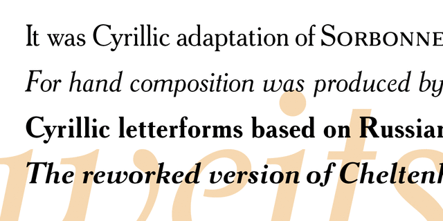 Гарнитура разработана в словолитном заведении Бертгольд (С.-Петербург) около 1910 на основе рисунков шрифта Sorbonne, 1905 (H. Berthold, Berlin), близкого к шрифту Cheltenham фирмы American Type Founders, 1896 (дизайнеры Бертрам Гудхью, Моррис Бентон), а также на основе русских шрифтов середины XVIII века. Малоконтрастный текстовой шрифт с историческим оттенком. Цифровая версия создана в Отделе наборных шрифтов НПО Полиграфмаш в 1989 году Любовью Кузнецовой. Корректировка и расширение гарнитуры проводилось в компании ПараТайп в начале 2000-х. Переработанная версия гарнитуры, в которую было добавлено жирное курсивное начертание, выпущена в 2009 году. В 2013 году выпущено расширенное нормальное начертание, в которое добавлены капительные знаки. Корректировки и расширения знакового комплекта выполнены Владимиром Ефимовым.