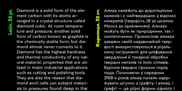 Almaz – это современный геометрический гротеск, вдохновленный украинским модернизмом 20-го века. Он имеет динамические формы букв и авангардный характер. Шрифт спроектирован для логотипов, заголовков, книжных обложек, айдентики, также может использоваться для набора небольших объемов текста. Гарнитура состоит из 9 насыщенности (от супертонкого к ультражирного). Шрифт разработали Сергей Макаренко и Кирилл Ткачев в 2020 году.