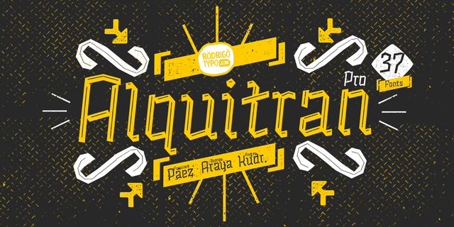 Шрифт по мотивам pixaçao или pichaçao — особый жанр граффити, возникший в Сан-Паулу в 1980-е годы, хотя в 1960-е годы уже существовали подобные граффити против военной диктатуры, в контексте профсоюзной борьбы. Это были протестные теги, нарисованные смолой (порт. piche — смола) на зданиях на большой высоте. В шрифте Alquitran (исп. Alquitrán — деготь) этот уникальный вид леттеринга переработан в несколько более формальном стиле, добавлены разные начертания с поддержкой многих языков, включая кириллицу, и декоративные орнаменты. Шрифт разработали Родриго Арая Салас, Франциско Паез и Андрей Кудрявцев в 2018 году.