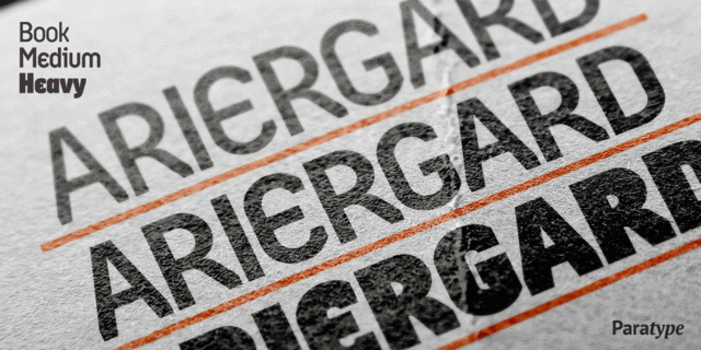 ПТ Арьергард™ Гарнитура из трех начертаний разработана дизайнером Олегом Карпинским в 2000-2001 годах и лицензирована фирмой «ПараТайп». Отличается жесткой геометричностью рисунка. Использованы старинные кирилловские графемы: N с диагональным штрихом, симметричные прописные У и Ч, выносная строчная г, а также т с выносным элементом. Годится для набора небольших текстов любого рода и для акциденции.