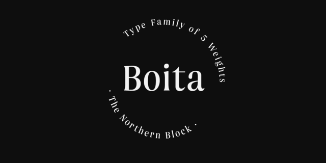 Boita – это элегантная акцидентная антиква. Гарнитура создана для сильного воздействия, она отличается большой высотой строчных, высокой контрастностью, уверенными формами и острыми засечками. Его сжатые пропорции позволяют привлекать внимание даже в условиях ограниченного пространства. Boita формирует на странице «гладкую, как бархат» текстуру, сохраняя ощущение отчетливой уверенности. Семейство поддерживает как латиницу, так и кириллицу. Шрифт разработала Мария Пигулевская в 2016 году. Botia™ является торговой маркой компании The Northern Block.