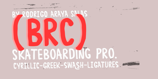 BRC – неформальный рукописный шрифт со смелым уличным настроением с поддержкой множества европейских языков, а также кириллицы и греческого. Этот шрифт имеет богатые возможности в виде альтернативных глифов, росчерков и редких лигатур. Шрифт BRC разработал Родриго Арая Салас в 2014 году.