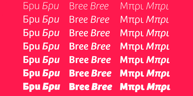 Bree – это динамичный гротеск, придающий особый характер любому тексту в брендинге и заголовках. Формы прямого курсива создают приятное сочетание ненавязчивых заглавных букв с более яркими строчными, что придает тексту живой вид. Шрифт создан под влиянием дерзкого почерка, проявляющего неординарную личность. В семейство входят 7 прямых начертаний, 7 курсивных и 2 вариативных начертания. Bree получил бронзовую награду на Европейском Фестивале Дизайна 2009. Гарнитуру разработали Вероника Буриан и Хосе Скаглионе в 2008-2019 году.