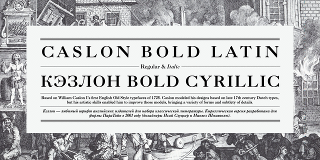 Версия фирмы Bitstream шрифта Caslon Bold фирмы American Typefounders, 1905. Шрифт разработан на основе первой английской антиквы старого стиля знаменитого типографа Уильяма Кэзлона I, выпущенной в 1725 году. Кэзлон создавал свои шрифты по образцу голландских шрифтов XVII века, но его художественное мастерство позволило ему улучшить качество своих шрифтов, привнеся в них разнообразие форм и искусность деталей. В шрифтах Кэзлона основные штрихи тяжелее, чем в большинстве антикв старого стиля, засечки толще и несколько коренастее. Наклон курсивных знаков колеблется.В целом текст, набранный Кэзлоном, выглядит привлекательно и хорошо читается. Кэзлон - любимый шрифт английских издателей для набора классической литературы. Кириллическая версия разработана для фирмы ПараТайп в 2001 году (дизайнеры Исай Слуцкер и Манвел Шмавонян).