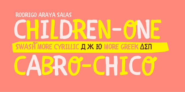 Children One – неформальный рукописный шрифт с игривым и добродушным настроением с поддержкой множества европейских языков, а также кириллицы и греческого. Этот шрифт имеет богатые возможности в виде альтернативных глифов, росчерков и редких лигатур. Шрифт Children One разработал Родриго Арая Салас в 2014 году.