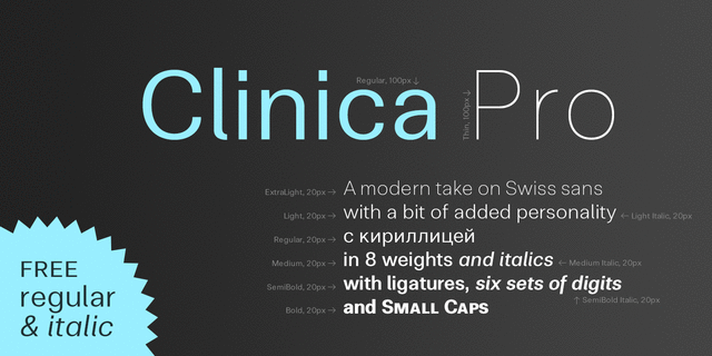 Clinica Pro – современный, достаточно нейтральный швейцарский гротеск с индивидуальными чертами в 8 весах с курсивом. Содержит 6 наборов цифр, капитель и множество лигатур. Шрифт разработал и выпустил Андрей Константинов в студии Mint Type в 2013 году.