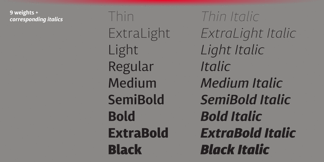 Этот современный гротеск разработан как универсальная читабельная «рабочая лошадка» для текстов и заголовков. Достаточно высокие строчные знаки и статичные формы способствуют комфортному чтению, как узких газетных колонок, так и страниц электронных изданий.