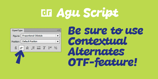 Шрифт Агу Скрипт – это семейство с набором из девяти курсивных начертаний от сверхсветлого до сверхжирного. Может применяться для неформальных текстов, детских книжек и приложений. Шрифт разработан Дмитрием Растворцевым в 2016 году.