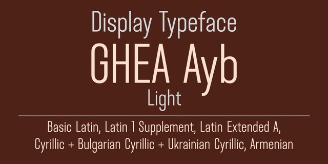 Этот узкий акцидентный гротеск может использоваться в названиях, заголовках и коротких текстах. Ayb поддерживает расширенную латиницу, кириллицу, включая украинские и болгарские варианты букв, а также армянский алфавит. Шрифт разработал Эдик Габузян в 2020 году.
