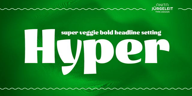 Hyper – это максимально заголовочный шрифт для фруктов, овощей, цветов и всех красивых и здоровых вещей, которые наполняют вашу жизнь радостью и удовольствием. Hyper выглядит лучше всего на больших и даже огромных размерах. Поэтому, для тонкой настройки дизайна, Hyper отображается в двух основных начертаниях: Hyper Black создан для заголовков и логотипов. Hyper Grande сделан для очень больших надписей на плакатах или больших баннерах. Оно имеет немного больше элегантности за счет более тонких горизонтальных штрихов. Хорошо сформированные буквы Hyper рифмуются друг с другом, как-будто держатся за руки.