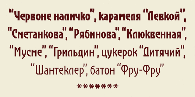 Основой этого шрифта стала реклама Киевской кондитерской фабрики. Затем шрифт был расширен до шрифтовой гарнитуры, что значительно увеличило возможности использования. Стилистически шрифт несет все признаки гротеска в стиле Модерн – сдвинутые вверх и вниз оптические оси, искривленные дуги и прямые штрихи, капризные и неожиданные решения отдельных букв. В то же время некоторая геометризированность позволяет ему уверенно держать строку, а суженные пропорции и светлые начертание прекрасно подходят для составления небольших надписей в рекламе, вывесках, журналах, меню, упаковке и т.п. Шрифт разработали Геннадий Заречнюк и Виктор Харик в 2019–2020 годах.