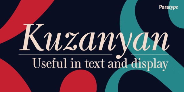 ПТ Кузанян™ Шрифт был разработан для ручного набора в 1959 году в Отделе наборных шрифтов НПО Полиграфмаш известным советским художником книги и шрифта Павлом Михайловичем Кузаняном (1901-1992). Затем в 1960-е годы гарнитура была переработана для строкоотливного и крупнокегельного набора. Контрастный, чуть зауженный шрифт типа антиквы нового стиля, с элементами каллиграфии остроконечным пером. Предназначен для титульного и текстового набора научной, художественной и искусствоведческой литературы, а также для акциденции. Переработанная и дополненная цифровая версия создана в фирме ParaType в 2001 году (дизайнер Любовь Кузнецова).
