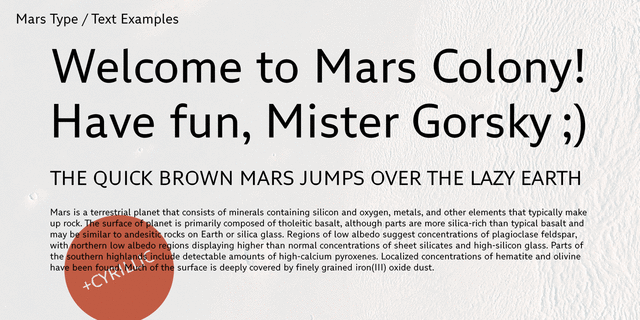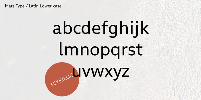 Mars Type – это гротеск с открытыми формами и другими чертами, повышающими его распознаваемость и удобочитаемость. Идеально подходит для навигации и интерфейсов в марсианской колонии. Главной фишкой шрифта является особая форма овальных символов (идеальный круг снаружи, «иллюминатор» внутри) и соответствие угла наклона некоторых знаков (например, слеш) углу наклона оси вращения Марса – 25,19°. Вертикальные срезы открытых знаков, как в шрифтах Futura или Gill Sans, позволяют новому шрифту иметь высокую емкость, как у гуманистических гротесков, но сохранять видимую геометричность. Шрифт Mars Type разработан Евгением Садко в 2018-2019 году и выпущен компанией Rentafont по бесплатной лицензии SIL Open Font License (OFL).