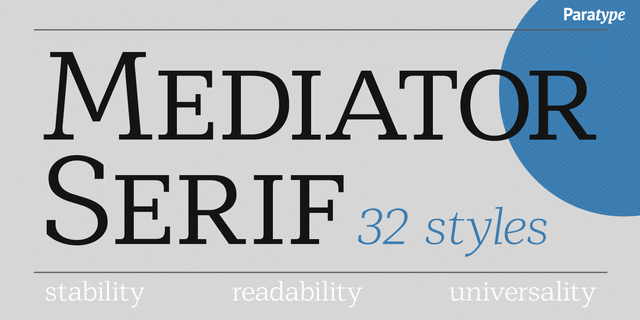Mediator Serif — спокойная и уравновешенная современная антиква, которая идеально сочетается с гротеском Mediator по рисунку и пропорциям. Шрифт хорошо работает как в сплошном тексте, например, в деловой литературе и периодике, так и в коротких текстах, упаковке и брендинге. Гарнитура состоит из 32 начертаний: 8 прямых и 8 курсивных достаточно широких пропорций, от Thin до Black, и 8 зауженных начертаний со своими курсивами. Минускульные цифры и капитель во всех начертаниях служат приятным дополнением к знаковому составу шрифта. Шрифт спроектирован Манвелом Шмавоняном при участии Александра Любовенко и выпущен компанией ПараТайп в 2017 году.