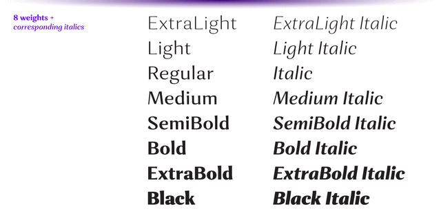 Шрифт имеет 8 вариантов насыщенности от сверхсветлого до сверхжирного + соответствующий реальный курсив. Каждое начертание поддерживает многочисленные языки на латинице, основные кириллические языки и содержит множество опен-тайп фич: лигатуры, капитель, 5 наборов цифр, 4 стилистических набора в прямых начертания и 1 в курсивном, дроби, индексы, различные знаки пунктуации, включая пунктуацию для капитального набора, а также языковые альтернативы.