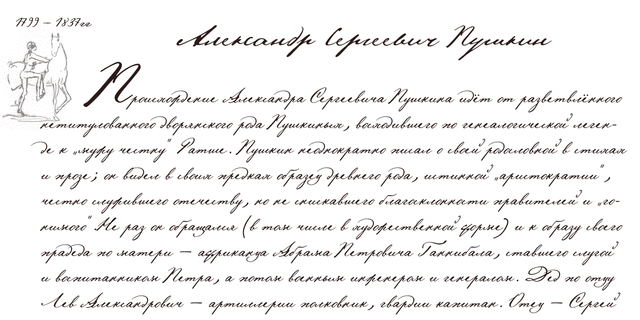 Серия шрифтов 'Пушкин' разработана для фирмы ПараТайп в 1999-2004 годах (дизайнер Геннадий Фридман). Шрифт создан на основе автографов А.С. Пушкина. В комплект знаков шрифта включены альтернативные варианты некоторых букв, характерные для почерка поэта. Шрифт Пушкин Скрипт в двух начертаниях основан на рукописях 1815 года и содержит комплект знаков для набора помимо русского на основных западноевропейских языках. Пушкин Один создан на основе наиболее аккуратно написанных документов. Пушкин Два имитирует вариант мелкого, но тем не менее достаточно разборчивого почерка. Пушкин Три также имеет 2 начертания разных насыщенностей и имитирует автографы, отличающиеся размашистым написанием букв. Шрифты серии Пушкин 1, 2, 3 содержат только буквы русского алфавита. В дополнение к ним спроектирован шрифт Пушкин Франс в западноевропейской комплектации.