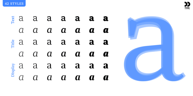 Rolleston – строгое шрифтовое семейство с клиновидными засечками. Гарнитура содержит 42 начертания, по 14 для трех оптических размеров: Text, Title, и Display.