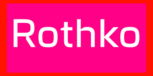 Rothko – крепкий, статичный гротеск. Округлые формы стремятся к квадрату. Плавный силуэт букв контрастирует с чётким ритмом набора. Ярким акцентом выступают места соединение диагональных штрихов. Шрифт содержит стандартный набор латиницы и кириллицы, математические символы, стандартные лигатуры, а также лигатуру для украинской пары «її». Rothko предназначен для плакатных слоганов и ярких заголовков. Шрифт разработал Алексей Поповцев в 2018 году.