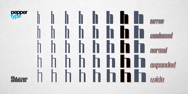 Высококонтрастная версия шрифта Штозер. Акцидентный шрифт в стиле ретро, созданный по мотивам 1960-х и 1970-х годов, дополнительно вдохновленный кириллической вязью. Он поставляется в 8 весах, с 5 вариациями ширины для каждого, все сопровождаются соответствующими наклонными версиями – в общей сложности 80 начертаний. Shtozer – шрифтовое семейство с широким языковым охватом, включающее кириллицу. Гарнитура также содержит множество функций OpenType и альтернативных символов для оживления набора. Шрифт разработал Олег Лищук в 2020 году.