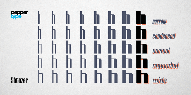 Максимально контрастная версия шрифта Штозер. Акцидентный шрифт в стиле ретро, созданный по мотивам 1960-х и 1970-х годов, дополнительно вдохновленный кириллической вязью. Он поставляется в 8 весах, с 5 вариациями ширины для каждого, все сопровождаются соответствующими наклонными версиями – в общей сложности 80 начертаний. Shtozer – шрифтовое семейство с широким языковым охватом, включающее кириллицу. Гарнитура также содержит множество функций OpenType и альтернативных символов для оживления набора. Шрифт разработал Олег Лищук в 2020 году.