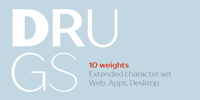 Шрифт Drugs разработан специально для фармацевтики и бытовой химии. Он идеально подойдет для дизайна упаковки лекарства, зубной пасты или стирального порошка. Гарнитура имеет 5 насыщенностей, наклонные начертания и приспособлена для любой поверхности: бумага, картон, металл, стекло. Drugs одинаково хорошо выглядит как в текстовом, так и в акцидентном применении. Шрифт разработан в студии TypeType в 2014 году.