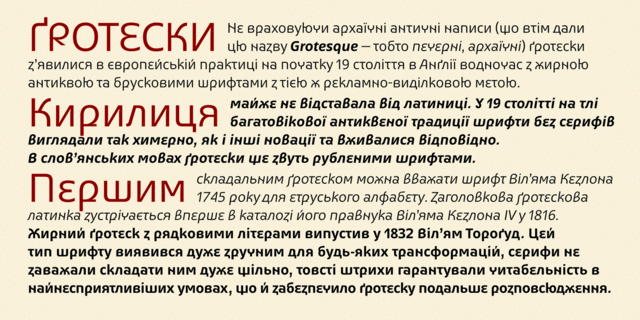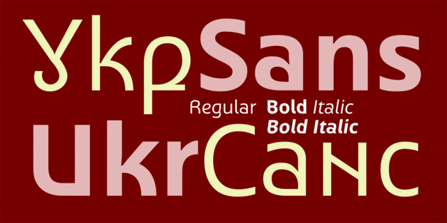 Украинский гротеск – простой, демократичный и универсальный шрифт, построенный по принципам, которые преподает Василий Яковлевич Чебаник – автор «Графіки Української Мови». UkrSans поддерживает расширенную европейскую латиницу и современную славянскую кириллицу. Шрифт разработал Виктор Харик в 2019 году.
